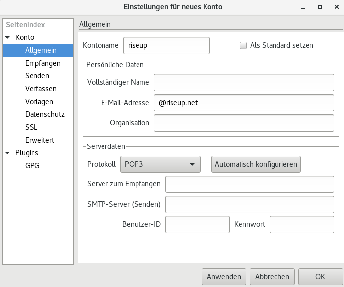 1. Allgemein – gib Kontoname, Name und E-Mail-Adresse ein, wähle den Servertyp POP3 oder IMAP, verwende mail.riseup.net als Server zum Empfangen und SMTP-Server. Für deinen riseup.net-Namen (ohne @riseup.net), sowie dein Passwort hinzu.
