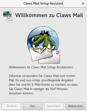 Beim ersten Start von Claws Mail wird dich der Einstellungs-Assistent bei der Kontoerstellung unterstützen. Wenn er sich nicht öffnet, siehe Manuelle Kontoerstellung weiter unten.